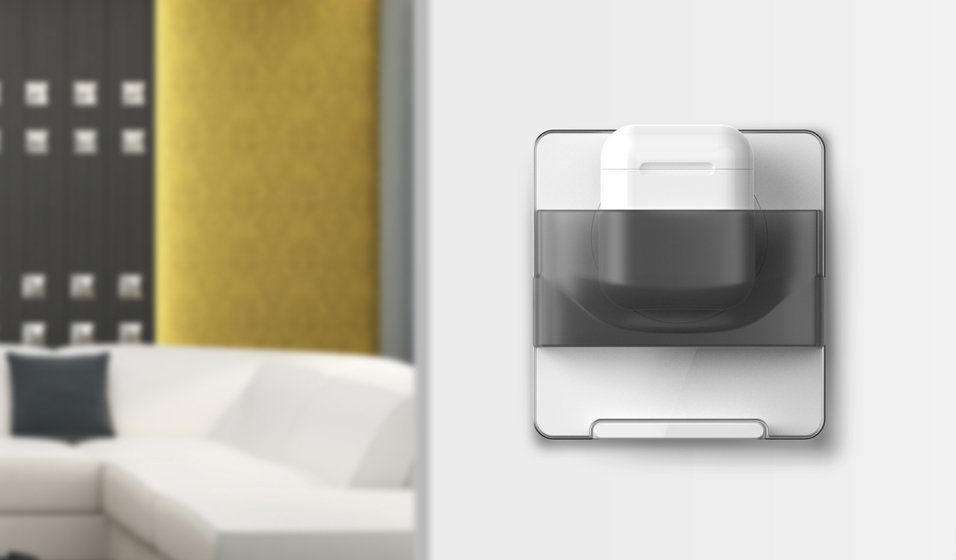 无线充电底座圆润大气的外观,个性美学,便捷实用,通过侧面U型槽位卡紧表带满足充电,通过正面U型轮廓贴合耳机盒进行充电,通过整体收形趋势贴合市面上各类手机的尺寸。