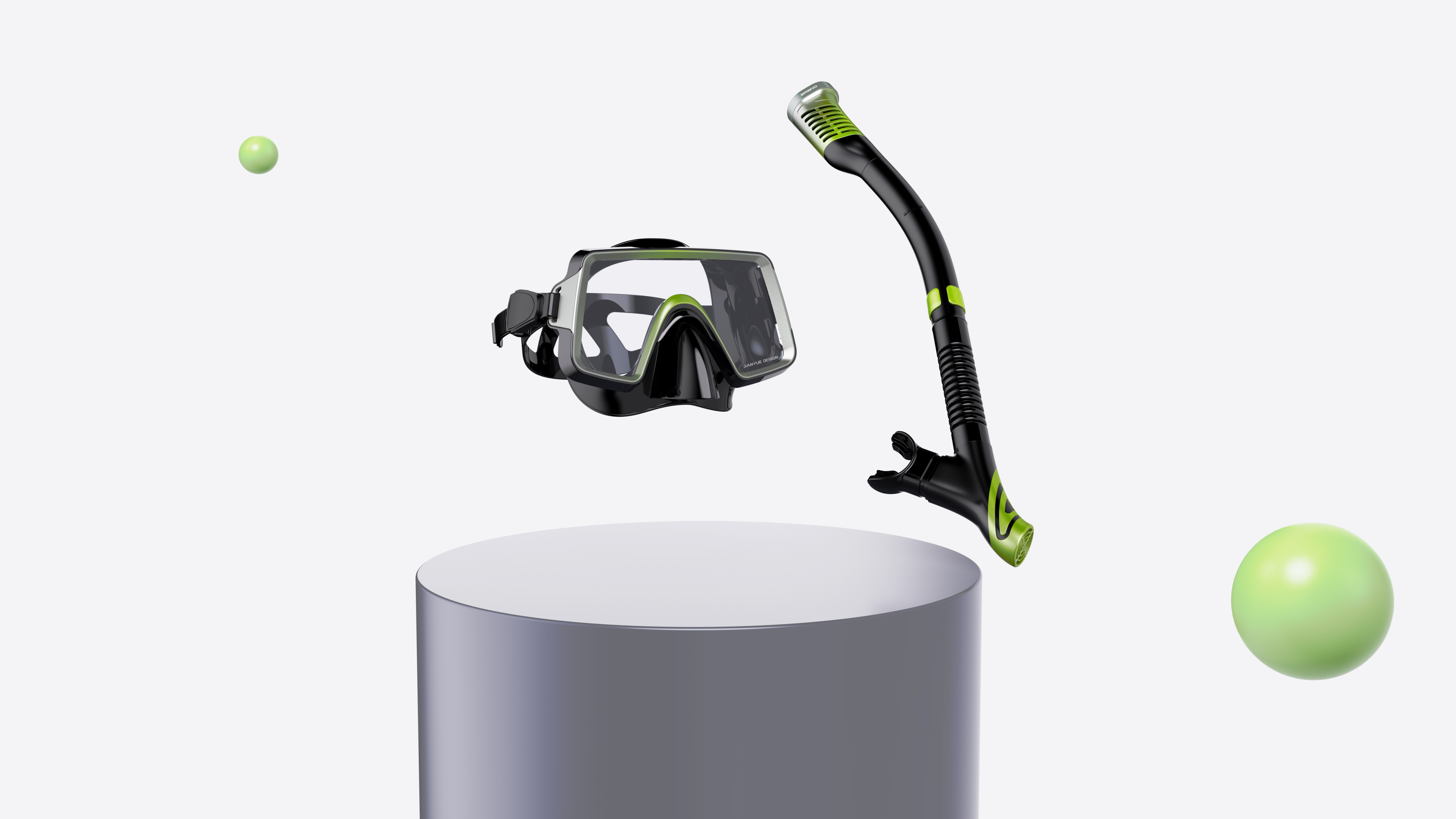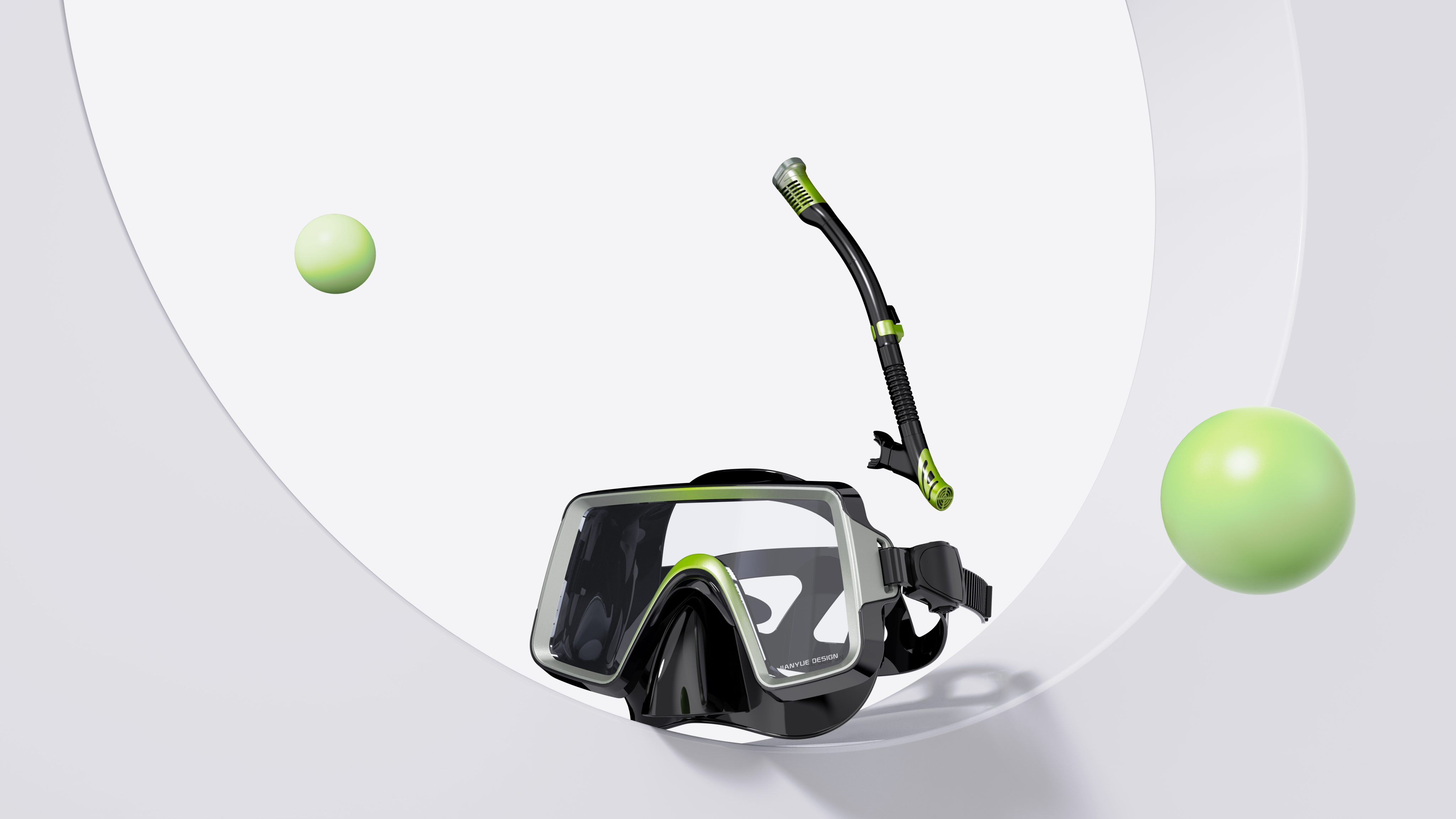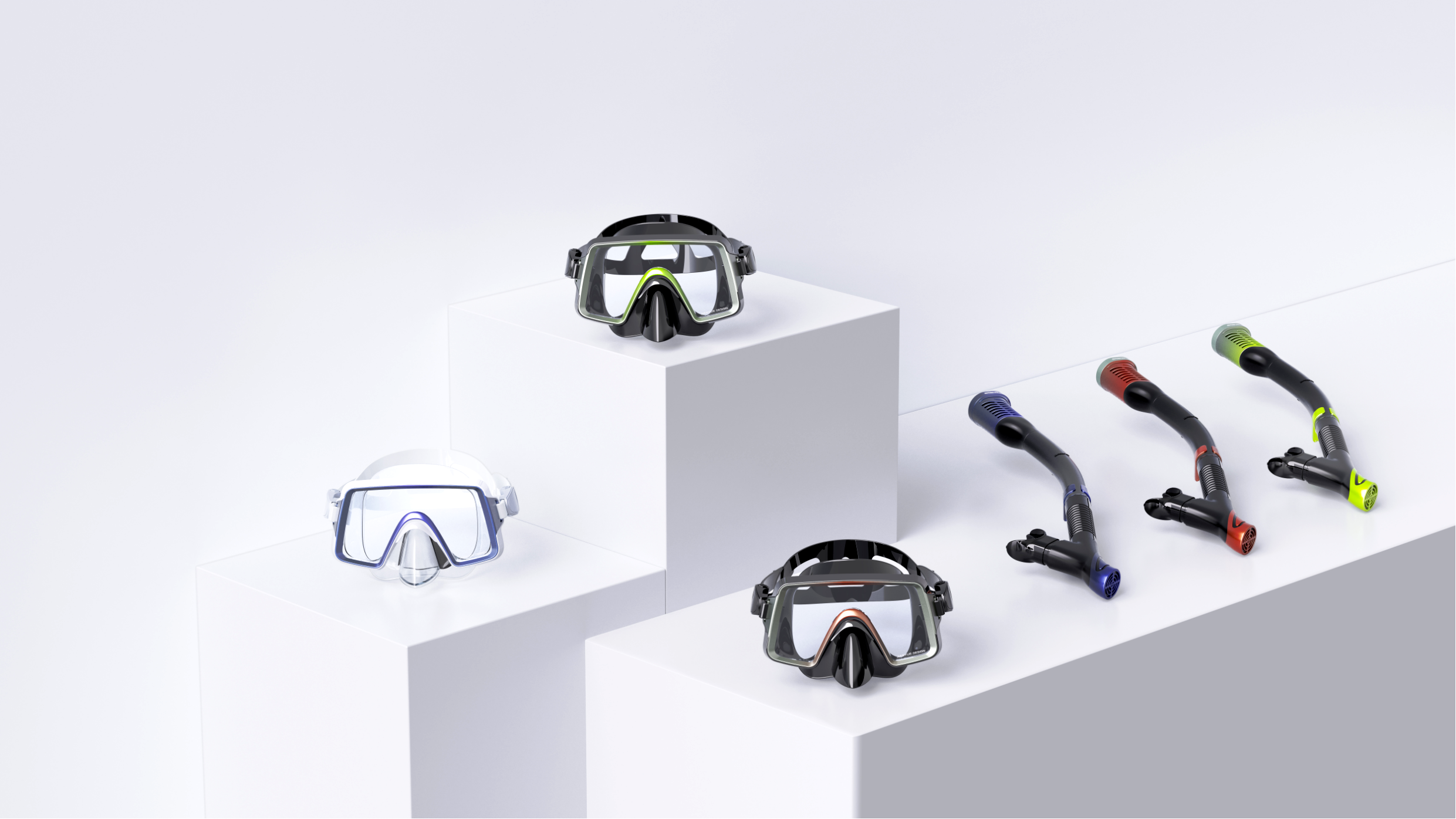 ●我们认为,好的设计不能只追求外观的新颖而忽略功能的实用性,也不能为了功能而牺牲美学价值。在浮潜眼镜的设计中,我们采用流畅的线条和独特的色彩搭配,赋予其现代感和时尚感,同时这些线条和造型也符合流体力学原理,能减少水下阻力。